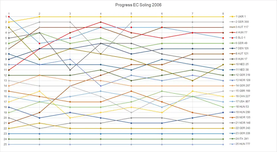 | Rank | Country | Helmsman | Crew | Sail No. | Race 1 | Race 2 | Race 3 | Race 4 | Race 5 | Race 6 | Race 7 | Race 8 | Total | Total – discard | ||||||||