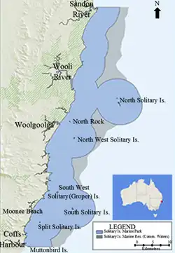 Solitary Islands Marine Park (SIMP) is a marine park in New South Wales State waters, Australia. It adjoins the Solitary Islands Marine Reserve (Commonwealth Waters) and was declared under the Marine Parks Act 1997 (NSW) in January 1998.[2] Prior to this it was declared a marine reserve in 1991.[3] The Park was one of the first declared in NSW and stretches along the northern NSW coast, from Muttonbird Island, Coffs Harbour, to Plover Island near Sandon River, 75 kilometres to the north. It includes coastal estuaries and lakes and extends from the mean high water mark, to three nautical miles out to sea, covering an area of around 72,000 hectares.[4] There are five main islands in the Park, North Solitary Island, North West Solitary Island, South West Solitary Island (Groper Island), South Solitary Island and Split Solitary Island, as well as other significant outcrops such as Muttonbird Island and submerged reefs.