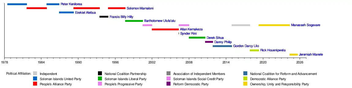 The prime minister of Solomon Islands is Solomon Islands' head of government, as elected by the National Parliament. Since May 2024 Jeremiah Manele has been the prime minister of Solomon Islands.