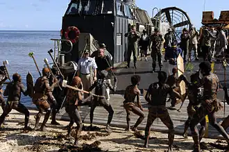 Dancing is often accompanied by bamboo bands, and panpipes are a popular accompaniment.[6][7] Women are often topless while performing dance in the Solomon Islands; in some of the western islands, they may wear breechcloth made from blue-dyed tapa cloth as a wrap-around skirt.[8] In Tamate dance, performers wore whole body costumes made of bamboo with a curious mythological appearance.