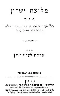 - Melitsat Yeshurun [The Eloquence of Jeshurun] (in Hebrew). Vienna: A. Schmid. 1816. hdl:2027/hvd.hwnlzx.