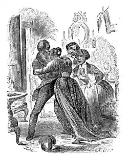 Northup returned to Sandy Hill on January 21, 1853, and reunited with his wife and children.[14] By 1855, he was living with his daughter Margaret Stanton and her family in Queensbury, Warren County, New York.[34] He purchased land in Glens Falls near his daughter.[14] In his memoir, Northup described his love for his wife as "sincere and unabated" since the time of their marriage, and his children as "beloved".[35]
