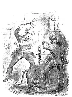 Under Tibaut, Northup suffered cruel and capricious treatment. Tibaut used him to help complete construction at Ford's plantation. At one point, Tibaut whipped Northup because he did not like the nails Northup was using. But Northup fought back, beating Tibaut severely. Enraged, Tibaut recruited two friends to lynch and hang Northup, which an enslaver was legally entitled to do. Ford's overseer Chapin interrupted and prevented the men from killing Northup, reminding Tibaut of his debt to Ford, and chasing them off at gunpoint. Northup was left bound and noosed for hours until Ford returned home to cut him down.[69] Northup believed that Tibaut's debt to Ford saved his life. Historian Walter Johnson suggests that Northup may well have been the first person Tibaut ever enslaved, marking his transition from itinerant employee to property-owning enslaver.[70]