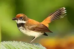 The Solomons rufous fantail was formally described in 1879 by the Australian ornithologist Edward Pierson Ramsay based on a specimen that had been collected by James F. Cockerell on Guadalcanal in the Solomon Islands. Ramsay coined the binomial name Rhissidura rufofronta (with the genus name Rhipidura misspelled).[1][2] The specific epithet combines Latin rufus meaning "red" with frons, frontis meaning "forehead" or "brow".[3] The Solomons rufous fantail was formerly considered to be a subspecies of the rufous fantail (renamed the Australian rufous fantail) (Rhipidura rufifrons) but is now treated as a separate species mainly based on the genetic differences.[4][5]