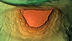 Solsbury Hill was an Iron Age hill fort occupied between 300 BC and 100 BC, comprising a triangular area enclosed by a single univallate rampart, faced inside and out with well-built dry stone walls and infilled with rubble.[7] The rampart was 6 metres (20 ft) wide and the outer face was at least 4 metres (13 ft) high. The top of the hill was cleared down to the bedrock, then substantial huts were built with wattle and daub on a timber frame.[8][9] After a period of occupation, some of the huts were burnt down, the rampart was overthrown, and the site was abandoned, never to be reoccupied.[10][11] This event is probably part of the Belgic invasion of Britain in the early part of the 1st century BC.[12]