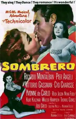 Sombrero is a 1953 American musical romance film directed by Norman Foster and starring Ricardo Montalbán, Pier Angeli, Vittorio Gassman, Cyd Charisse, and Yvonne De Carlo. The film is based on the 1945 book Mexican Village[3] by Josefina Niggli, a collection of 11 short stories set in the north Mexican town of Hidalgo.[4] In his long review for the October 16, 1945 issue of The New York Times, Orville Prescott calls it "remarkable...one of the finest books about Mexico I have ever read.”[5]