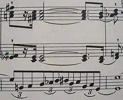 The first and second movements are in sonata form; the third movement is a fugue which also has elements of sonata form. An impression of spontaneous improvisation is achieved by the overlapping and enmeshing of phrases and movements, which allows the avoidance of regular structures. All thematic phrases are also shaped irregularly, producing such great diversity that no musical idea is repeated exactly.