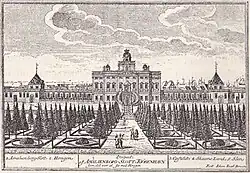 The queens acquisitions occupied an area roughly defined by present-day Bredgade, Frederiksgade, Amaliegade and Sankt Annæ Plads.[1] Work on the garden began in 1664 and from 1666 to 1667 the Frenchman Michel le Roy was responsible for its design, particularly that of the fountains and the water system.[1] The pleasure palace was built from 1669 to 1673 after Sophie Amalie had succeeded in providing the necessary means in spite of the hard times following the war. It is unclear who was the architect of the building but it is generally attributed to Albertus Mathiesen.[2] Another possibility is that le Roy was also involved in the design of the palace and not only the gardens. In early documents he is referred to merely as "Ingenieur", while he is later titulated "Baumeister der Koniginn".[1]