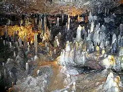 During renewed excavations in 1905 and 1906, a large number of remains of cave bears, cave lions, and hyenas were again found.[12] The total length of the cave, including the outer cave, was redetermined in 1966 by the Nuremberg Natural History Society to be 465 meters.[12] In 1971, the carbide lamps previously used in guided tours were replaced by electric lighting.[17] In the 1970s, the Hösch Cave, which had been closed and cut off during development work in 1833, was rediscovered. In 1997, the entire cave had to be remeasured again, as further discoveries were made in the course of more recent research work by speleologists from Bayreuth and Nuremberg. The new survey, together with the Hösch Cave, resulted in a length of about 900 meters.[2] In late summer of 2000, the show cave operation, with 34,000 visitors a year at last count, was discontinued due to safety deficiencies.