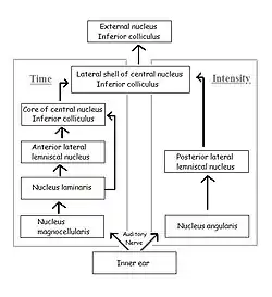 The fibers of the auditory nerve innervate both cochlear nuclei in the brainstem, the cochlear nucleus magnocellularis (mammalian anteroventral cochlear nucleus) and the cochlear nucleus angularis (see figure; mammalian posteroventral and dorsal cochlear nuclei). The neurons of the nucleus magnocellularis phase-lock, but are fairly insensitive to variations in sound pressure, while the neurons of the nucleus angularis phase-lock poorly, if at all, but are sensitive to variations in sound pressure. These two nuclei are the starting points of two separate but parallel pathways to the inferior colliculus: the pathway from nucleus magnocellularis processes ITDs, and the pathway from nucleus angularis processes IID.