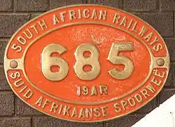 The number plate of no. 685, depicted alongside as it is displayed in the Outeniqua Transport Museum in George, is incorrectly inscribed "19AR" since that locomotive was retired without being reboilered with a Watson Standard boiler. The engine was photographed, still with its original boiler, as late as April 1970, fifteen years into electrification and dieselisation of the SAR and with steam traction already largely relegated to shunting and pickup work.