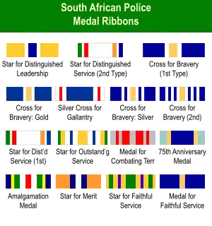 After South Africa became a republic (in 1961), the government instituted an entirely new series of decorations and medals for the SAP. It was added to several times over the years: