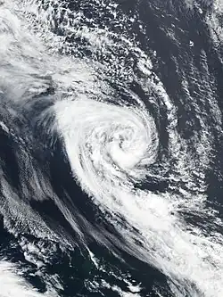 An extratropical cyclone formed on 26 June 2021, about 520 km (320 mi) east-southeast of Montevideo, Uruguay, associated with a cold airmass that acted over the region.[95] On the next day, the cyclone acquired a warm seclusion while intensifying, while it moved westwards and separated from the frontal system it was previously attached to.[95] As the system occluded, the seclusion deepened and started to acquire subtropical characteristics, which led it to be designated as a subtropical storm on 29 June.[95][96] It remained unnamed due to it being outside of the Brazilian Navy's area of responsibility.[97] By 23:30 UTC on 28 June, the Satellite Products and Services Division of the NESDIS declared the system to have become a tropical storm, based on a Dvorak rating of 3.5,[98] assigning an invest tag to it.[95] Although being affected by strong wind shear to its north due to a subtropical jet caused by the presence of a frontal system nearby, it further intensified and achieved a minimum pressure 986 millibars (29.1 inHg), while tracking northeastwards towards the Brazilian area of authority.[95][99] At around 12:00 UTC on the next day, as the storm entered the boundary of METAREA V, Brazilian Navy's area of responsibility, thus it was assigned the name Raoni.[100] Continuing moving northeastwards, Raoni further developed an eye feature as well as a robust band to the east of the system.[101] Raoni began to weaken by 30 June, as the subtropical jet broke the barotropic flow over it, and NESDIS dropped the tag as it lost its convective bands.[95][102] On 1 July, Raoni lost its subtropical characteristics and degenerated into a low-pressure area.[95][103]
