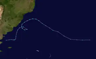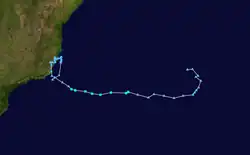 On 22 March 2019, a low-pressure area formed off the coast of Bahia after the passage of a frontal system.[57] On the next day, the cyclone developed a deep warm-core, thus being designated as a tropical depression.[57][58][59] On 24 March, the system intensified into a tropical storm, receiving the name Iba from the Brazilian Navy Hydrographic Center.[57] After moving southwestward for a couple of days, on 26 March, Iba reached its peak intensity.[57] Afterward, a cold front would approach the storm, which helped intensify the wind shear impacting Iba, leading to its weakening and extratropical transition.[57] On early 28 March, Iba would degenerate into a remnant low, becoming fully extratropical a day later.[57][60]