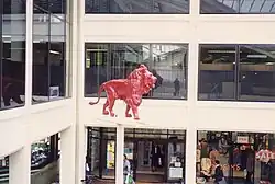 The lion was originally mounted on the parapet of James Goding's Lion Brewery on the Lambeth bank of the River Thames; Hungerford Bridge spanned the Thames nearby from 1845. The Lion Brewery closed in 1924 and the building was demolished in 1949, to make way for construction of the Royal Festival Hall as part of the Festival of Britain. The lion was removed, revealing the initials of the sculptor William Frederick Woodington and the date, 24 May 1837, under one of its paws. It was painted red as the symbol of British Rail, and mounted on high plinth beside the entrance to the Festival of Britain near Waterloo station.