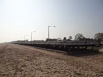 The plans called for a 180-foot-wide (55 m) beach to be built before the boardwalk, but construction did not progress in that exact sequence, which resulted in some parts of the boardwalk site being flooded at high tide. As a result, WPA employees sometimes worked 6-hour days and other times worked less than 4 hours in a day.[56] Nevertheless, the boardwalk was built relatively quickly, and the first 1-mile (1.6 km) section between Fort Wadsworth and South Beach was nearly completed by the end of 1936.[57] Twelve jetties and a parallel beach section had also been completed, though a section across New Creek in Midland Beach was progressing slowly.[55] By June 1937, the entire boardwalk was essentially completed.[58] An official opening ceremony was held on July 4, 1937, and was attended by 25,000 people. Upon its opening the boardwalk was named after U.S. president Franklin D. Roosevelt, who participated in the ceremonies remotely.[36][59][60]