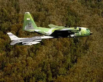 An F-16C Fighting Falcon Block 52 of the 157th Fighter Squadron flies next to a Lockheed C-130H-LM Hercules from the 169th Operations Support Flight, 169th Fighter Wing. The 157th is the oldest unit in the South Carolina Air National Guard, having over 50 years of service to the state and nation. | |