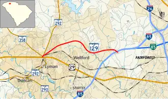 South Carolina Highway 129 (SC 129) is a 4.970-mile (7.998 km) state highway in the U.S. state of South Carolina. It connects Falling Creek Road near Spartanburg with U.S. Route 29 (US 29) and SC 292 in Lyman. It also has an interchange with Interstate 85 (I-85) just north of its southern terminus. The highway is known as Fort Prince Boulevard.