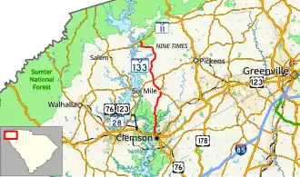 The route of SC 133 travels generally in a south–north direction, beginning at an intersection with U.S. Routes 76 (US 76) and 123 and SC 28 in Clemson. SC 133 passes under a Norfolk Southern railway viaduct and leaves the Clemson area, passing by Lake Hartwell. The highway skirts rural areas west of Central before entering the community of Six Mile. North of Six Mile, SC 133 becomes more rural and hilly in nature before terminating at SC 11, near Lake Jocassee and Devils Fork State Park.[2]