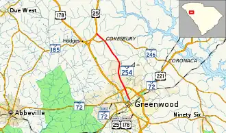 South Carolina Highway 254 (SC 254) is a 8.230-mile-long (13.245 km) state highway in the U.S. state of South Carolina. The highway connects Greenwood and Cokesbury.