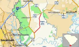 South Carolina Highway 315 (SC 315) is a 6.067-mile (9.764 km) state highway, serving as a more direct route between Savannah, Georgia and several Lowcountry communities in the U.S. state of South Carolina through southern Jasper County. Once the original alignment of SC 170 (until 1994) and SC 170 Alternate (SC 170 Alt.), this route was renumbered in 2010 to clarify conflicting and confusing route alignments. The route, known for the entire length as South Okatie Highway,[2] also serves the unincorporated community of Levy.
