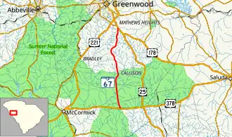 South Carolina Highway 67 (SC 67) is a 15.460-mile-long (24.880 km) state highway in the U.S. state of South Carolina. The highway travels through rural areas of Edgefield, McCormick, and Greenwood counties, as well as part of Sumter National Forest.