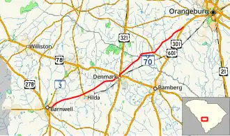 South Carolina Highway 70 (SC 70) is a 29.990-mile (48.264 km) primary state highway in the U.S. state of South Carolina. It connects the cities of Barnwell and Denmark with Orangeburg via U.S. Route 301 (US 301) and US 601.[4]