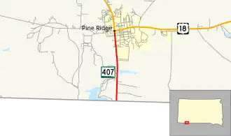 From its southern terminus SD 407 heads north along the eastern edge of, and then into, Pine Ridge. A few blocks after entering the main part of the community SD 407 reaches its northern terminus at an intersection with US 18 and BIA Route 32 (BIA Rd. 32). From the northern terminus of SD 407, US 18 heads easterly to Martin and Mission and northerly to Oglala and Hot Springs. BIA Rd. 32 heads westerly to terminate at BIA Route 41.[3][4] On average, SD 407 is driven by over 4,200 vehicles per day.[1]