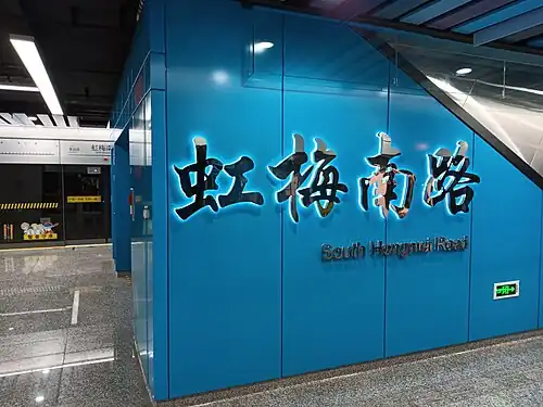 South Hongmei Road (Chinese: 虹梅南路; pinyin: Hóngméi Nán Lù) is a metro station on the Line 15 of the Shanghai Metro. Located at the intersection of South Hongmei Road and Yindu Road in Minhang District, Shanghai, the station is scheduled to open with the rest of Line 15 in 2020.[1][2] However, the station eventually opened on 23 January 2021 following a one-month postponement. This is the first station heading southbound that the station interior is blue. [3]