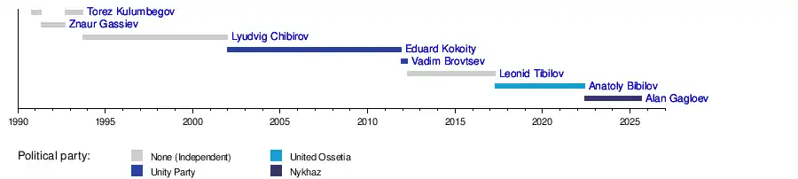| 5 | Alan Gagloev (born 1981) | 24 May 2022 | Incumbent | 3 years, 88 days | Nykhaz | 2022 | |