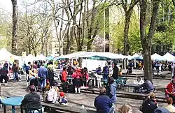 The primary Portland Farmers Market location, held in the South Park Blocks every Saturday from March to December attracts up to 14,000 people per weekend to the local food booths.[178][179][180] It was originally held at Broadway and Naito beginning in 1992, but moved to the Park Blocks in 1998.[181][182] A smaller market is held at the north end of the blocks on Wednesdays, and was held in Pioneer Courthouse Square until 1998.[183]