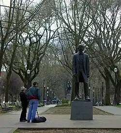 Every block contains public art, such as Shemanski Fountain (1926), designed by Carl L. Linde, with drinking wells, including special drinking wells for dogs.[165][166][167] Other art includes Paul Sutinen's In the Shadow of the Elm (built into the pavement),[168][169] and three large blocks of granite titled Peace Chant (1984).[3] Two large statues are in the block: a $40,000, 18 feet (5.5 m) bronze equestrian statue called Theodore Roosevelt, Rough Rider, designed by Alexander Phimister Proctor, commissioned by Roosevelt's personal friend and Portlander Henry Waldo Coe and added in 1922, and one of Abraham Lincoln, "facing north, slump-shouldered and pensive", added in 1928, commissioned by Coe in 1926, sculpted by George Fife Waters.[3][4][12][170][171][172][173]