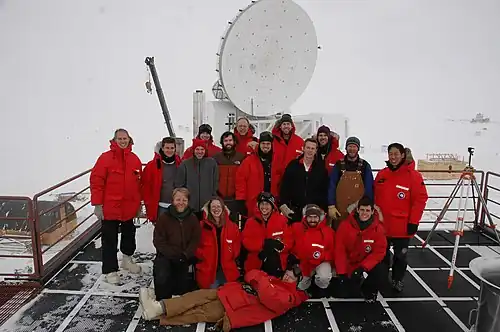 First light (the first observation) with the SPTpol camera was achieved on January 27, 2012. During the first season of observations, the winterover crew, Cynthia Chiang and Nicholas Huang, took data on a 100 square degree survey field. 2013 winterovers Dana Hrubes and Jason Gallicchio surveyed a larger field as part of the full SPTpol survey. This larger survey was completed by 2014 winterovers Robert Citron and Nicholas Huang, 2015 winterovers Charlie Sievers and Todd Veach, and 2016 winterovers Christine Corbett Moran and Amy Lowitz. The first winter of SPT-3G observing was conducted by winterovers Daniel Michalik and Andrew Nadolski. Adam Jones and Joshua Montgomery followed in 2018, with Douglas Howe and David Riebel wintering in 2019, Geoff Chen and Allen Foster in 2020, Sasha Rahlin and Matt Young in 2021, Aman Chokshi and Allen Foster in 2022, and Kyle Ferguson and Alex Pollak in 2023.[25]
