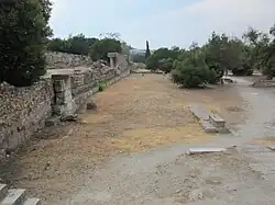 South Stoa II was a simple Doric colonnade facing to the north.[3] It was 93 metres long from east to west and 8.5 metres deep north–south.[4][5] The colonnade consisted of 30 columns, made of hard gray poros. The intercolumnation was 3.01 metres apart (unusually wide).[5] At the east and west ends there was a screen wall running between the columns, as was common in Hellenistic stoas.[5] The back wall was made of limestone blocks with conglomerate behind and served as a retaining wall for the higher ground behind it.[5][3] There was a fountain in a vaulted niche in the back wall of the stoa, in line with the 12th intercolumnation from the east end. This was supplied by an aqueduct under the street behind the stoa.[5][3]