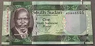 The banknotes feature the image of John Garang de Mabior, the late leader of South Sudan's independence movement.[8]