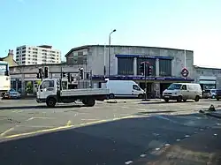 Along with the other stations on the Morden extension, the building was designed by architect Charles Holden. They were Holden's first major project for the Underground.[10] He was selected by Frank Pick, general manager of the Underground Electric Railways Company of London (UERL), to design the stations after he was dissatisfied with designs produced by the UERL's own architect, Stanley Heaps.[11] Built with a shop to each side, the modernist design takes the form of a double-height box clad in white Portland stone with a three-part glazed screen on the front façade divided by columns of which the capitals are three-dimensional versions of the Underground roundel. The central panel of the screen contains a large version of the roundel. The station is a Grade II listed building.[6][note 2]