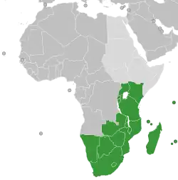 Southeast Africa,[1][2] or Southeastern Africa,[3][a] is an African region that is intermediate between East Africa[b] and Southern Africa.[c][8] It comprises the countries Botswana, Eswatini, Kenya, Lesotho, Malawi,[9] Mozambique,[10][11] Namibia, Rwanda, South Africa, Tanzania, Uganda,[12] Zambia and Zimbabwe[13] in the mainland, with the island-nations of Madagascar, Mauritius, Comoros, and Seychelles also included.[10]