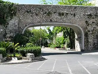 The Southport Gates are Gibraltar, the British Overseas Territory at the southern end of the Iberian Peninsula.[1][2] The gates are located in the Charles V Wall, one of the early fortifications of Gibraltar that defended the former southern limit of the city.[3][4] They are positioned between the South Bastion to the west and the Flat Bastion to the east, at the bottom of Trafalgar Hill, adjacent to the Trafalgar Cemetery (pictured below).[5][6][7] The original Southport Gate and the "New" Southport Gate are located at Trafalgar Road, while the most recent of the gates, Referendum Gate, provides access at Main Street.[8][9] The Southport Gates, together with a rifled muzzle loading ten inch 18 ton gun, are listed with the Gibraltar Heritage Trust.[5]