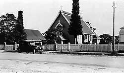 On Sunday 12 June 1887, Bishop William Webber officially opened St Peter's Anglican Church in Nerang Street on a site bequeathed to the church by Mr Pardoe. The plans for the church were supplied for free by architectal firm Banks and Carandini. However, a shortage of money prevented the design being fully built with many aspects incomplete at the time of the opening.[21] The church was at 87 Nerang Street. Circa 1900, the church was enlarged. In 1959, a new brick church (the current church) was built, with the old church being relocated to Gilston and converted into a house.[22][23]