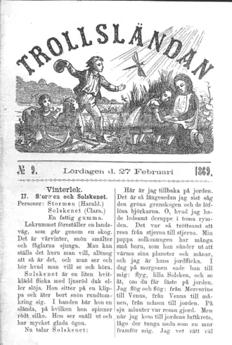 Topelius is considered to be the first author of Swedish-language literature specifically intended for children. From the 1840s till his death he wrote some 230 poems, songs, stories and fairy tales. He was also the first in Scandinavia to write plays for children. He appeared widely, including in Trollsländan, with columns under the heading Vinterlek ("Winter play"). He intended the pieces he wrote to become a part of children's play, not to be used as theatrical performances.[2]