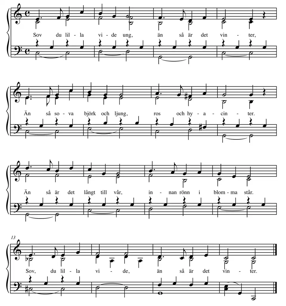 The most famous musical setting for the poem is by the Swedish composer Alice Tegnér (1864–1943).