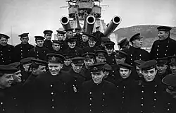 Molotov was laid down at the Marti South, Nikolayev on 14 January 1937, launched on 4 December 1939 and was completed on 14 June 1941. As the only ship in the Soviet Navy with radar, Molotov remained in Sevastopol for the initial period of Operation Barbarossa to provide air warning.[2] The advance of German troops into the Crimea in late October 1941 forced her to transfer to Tuapse where she continued to provide air warning.[2][8] However, the ship did bombard German troops near Feodosiya with nearly 200 180 mm shells on 9 November before returning to Tuapse. Molotov helped to carry the 386th Rifle Division from Poti to Sevastopol between 24 and 28 December 1941. While off-loading troops on 29 December her stern was damaged by German artillery and she shelled Axis positions in retaliation, firing 205 180 mm and 107 100 mm shells. The ship evacuated 600 wounded upon her departure on 30 December.[2]
