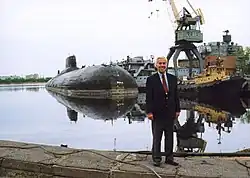 Work on the third generation of Soviet nuclear-powered submarines was accelerated in response to the development of the Trident submarine-launched ballistic missile (SLBM) by the United States. At their summit meeting in November 1974 in Vladivostok, Soviet General Secretary Leonid Brezhnev told U.S. President Gerald Ford that the Soviet Union would build a new strategic missile submarine if the U.S. continued its development of the Trident.[1] Brezhnev reportedly used the word typhoon ("тайфун") to refer to the new submarine, which later became its NATO code name.[2] It became a counter to the Ohio-class submarine of the United States Navy,[3] which was built to carry Trident nuclear missiles.[4] The Project 941 Akula (Russian: Акула, lit. 'shark', NATO reporting name: Typhoon class) was designed by the engineer Sergey Kovalyov at the Rubin Design Bureau, which began developing it in 1972. The R-39 missile that the submarine would carry was being worked on at the same time.[1]