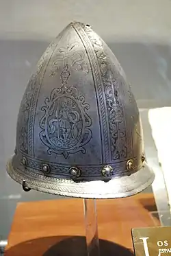 Metal armour was of limited use in the hot, wet tropical climate. It was heavy and had to be constantly cleaned to prevent rusting; in direct sunlight, metal armour became unbearably hot. Conquistadores often went without metal armour, or only donned it immediately prior to battle.[34] They were quick to adopt quilted cotton armour based upon that used by their native opponents, and commonly combined this with the use of a simple metal war hat.[35] Shields were considered essential by both infantry and cavalry; generally this was a circular target shield, convex in form and fashioned from iron or wood. Rings secured it to the arm and hand.[31]