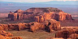 Spearhead Mesa is a mesa composed of three principal strata. The bottom layer is slope-forming Organ Rock Shale, the next stratum is cliff-forming De Chelly Sandstone, and the upper layer is Moenkopi Formation with a Shinarump Conglomerate caprock. The rock ranges in age from Permian at the bottom to Late Triassic at the top. The buttes and mesas of Monument Valley are the result of the Organ Rock Shale being more easily eroded than the overlaying sandstone.[5]