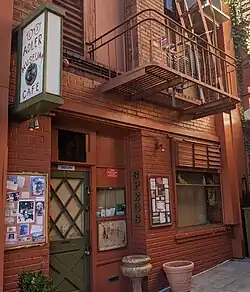 When Simmons took over the 12 Adler location, it already had a storied past. The space, originally built in 1850, had served as a Chinese Joss House before being destroyed in the 1906 earthquake and fires. It was then rebuilt in 1911, and it served as a speakeasy (1919–33) during prohibition. In 1937, the space became a social/political club for Alaska fishermen, followed by a serviceman's bar (1941–45). After the war, it became bohemian hangout (1945–48).[13] In the early 1950s, the space was a lesbian bar called Tommy's Place/12 Adler Place,[14] where an infamous 1954 police raid took place.[15][16][17] Afterward, the location became the nightclub "Frank's," owned by Frank Guidera,[18] which featured Middle Eastern music, jazz music, and bellydancers.[14][19] However, in 1965, North Beach nightlife changed when San Francisco legalized topless dancing[20][14] and figures such as Carol Doda danced at the Condor Club.[21] Simmons explained, "By that time North Beach turned into this big topless thing. There were only a few spots for locals to hang out. I was sick of swinging a hammer and I figured, maybe I’d find a joint."