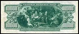 In 1837, Robert Walter Weir was commissioned by the United States Congress to paint an historical depiction of the Pilgrims. This painting was placed in the U.S. Capitol Rotunda at Washington, D.C. in December 1843. Known as The Embarkation of the Pilgrims, the 12 by 18 feet (3.7 by 5.5 m) painting is a scene on board Speedwell while harboured in Delfshaven, Holland. The historical event dramatized took place on 22 July 1620.[7] Weir would later paint another, much smaller oil on canvas that is now displayed in the Brooklyn Museum of Art. The paintings are similar except for lighting and a few minor changes. The 1857 work measures about 4 by 6 feet (1.2 by 1.8 m). The Embarkation of the Pilgrims is depicted on the reverse of the 10,000 dollar bill (Federal Reserve Note) issued in 1918.[8] Only five examples of this bill are known, and "none exist outside of institutional collections."