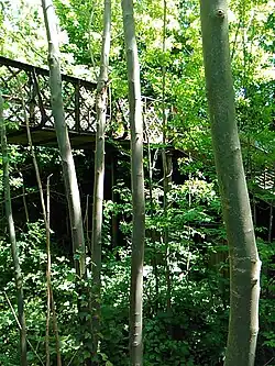The footbridge over the station in 2018, the line beneath overgrown with trees