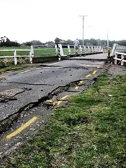 Damage to bridge on Spencerville Road crossing the Lower Styx river after the 2010 Canterbury earthquake