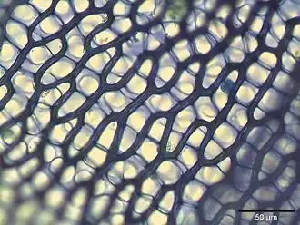 Branch leaves measure 1.1–2.2 mm in length and are arranged irregularly around the branches rather than in distinct rows.[7] Each leaf has a lance-like shape with slightly curved edges and an inrolled tip (involute apex).[8] The leaves' cellular structure shows regular patterns of strengthening fibers and has many small holes (pores) where cells meet (commissures).[2] The pores show a distinctive pattern: on the convex surface, they grade from small near the leaf apex to large at the base, while the concave surface features large round pores at the leaf apex and along the margins.[8] They contain specialised cells for water storage (hyaline cells) that vary in size, being smaller near the tip (60–90 by 15–20 μm) and larger towards the base (up to 170 by 30–40 μm).[7]